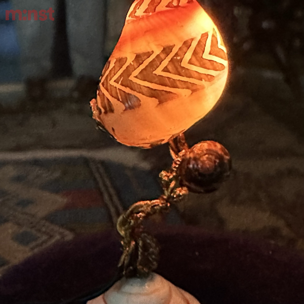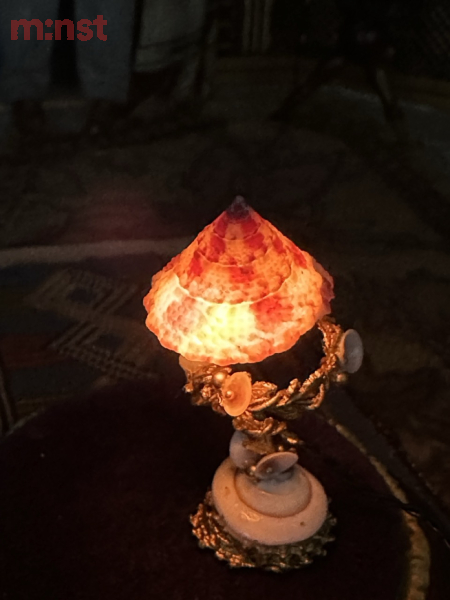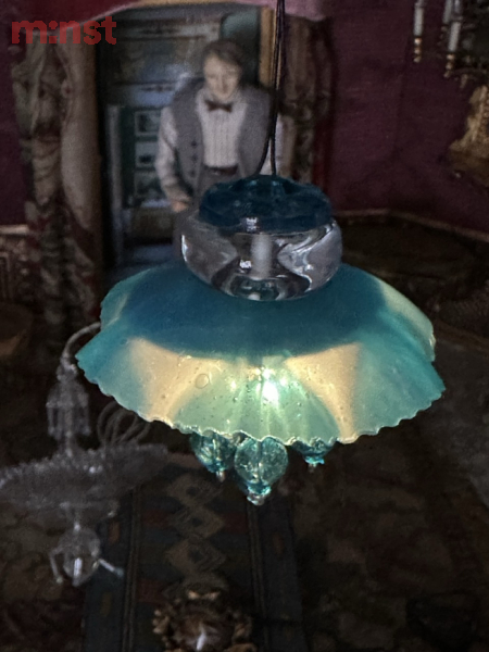 Made of glass teardrops and crystal beads. The hollow glass bead with 12V lamp is hand painted on the inside.